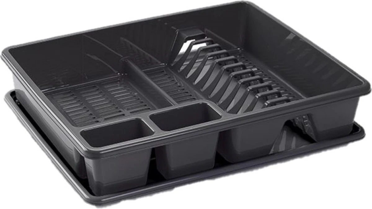 Afwasrek/afdruiprek/droogrek met lekbak om het water op te vangen zodat niet het hele aanrecht nat wordt. Kleur: donkergrijs. Afmeting: ca. 48 x 38 x 9 cm. Materiaal: kunststof.