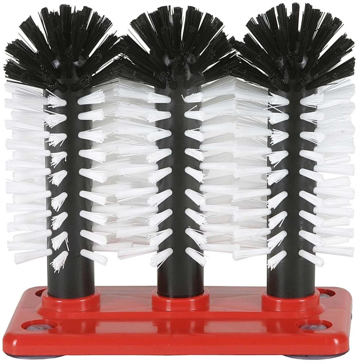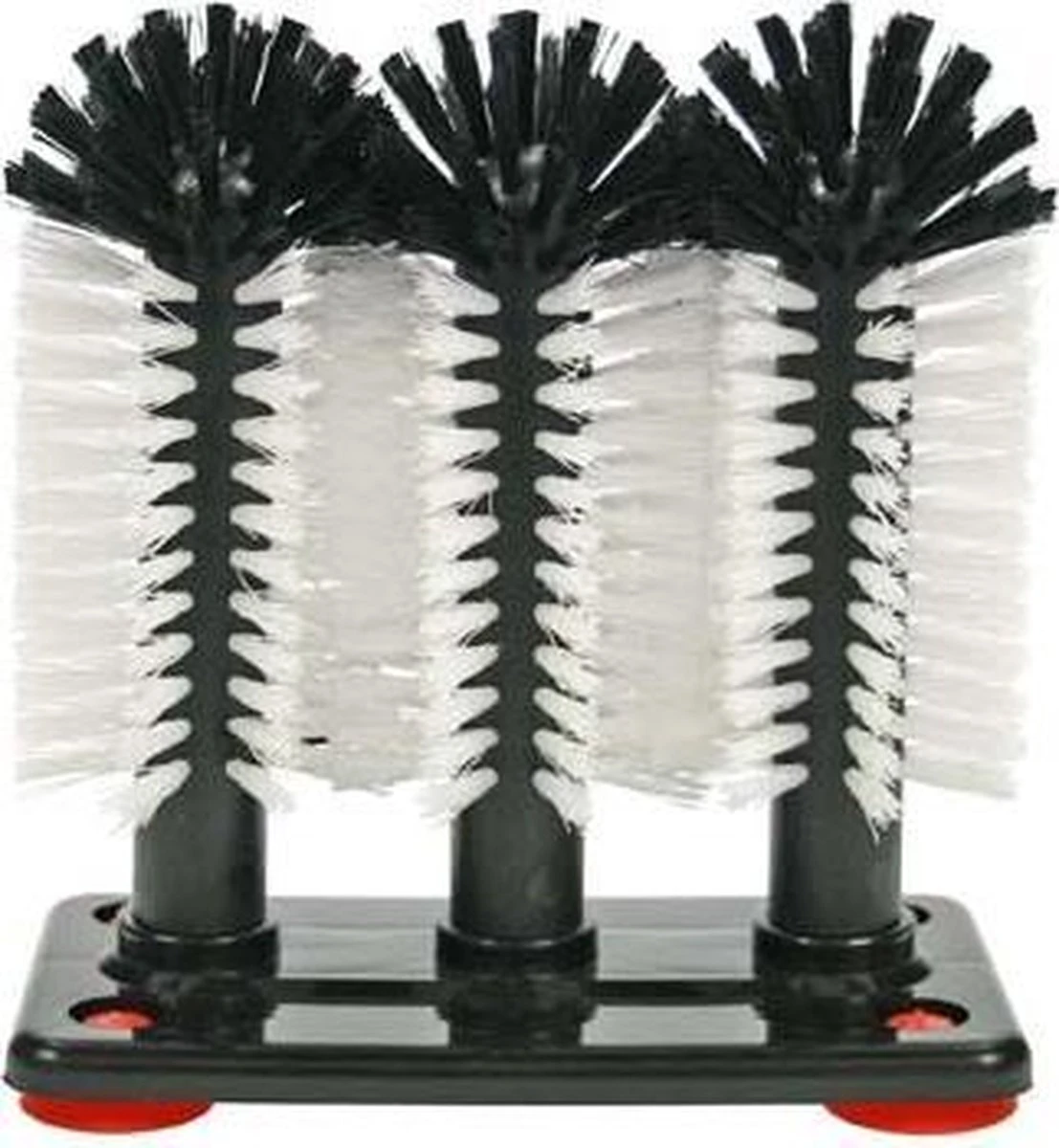 3-delige spoelborstel 18 cm hoog op stevige kunstof voet, met zuignappen aan de onderzijde zodat de spoelborstels goed vast blijven zitten in de spoelbak.