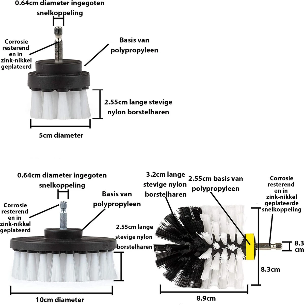 | Verpakkingsinhoud | Drie grote platte borstels van 10 cm Drie kleine ronde platte borstels van 5 cm Drie ronde borstels van 9 cm |