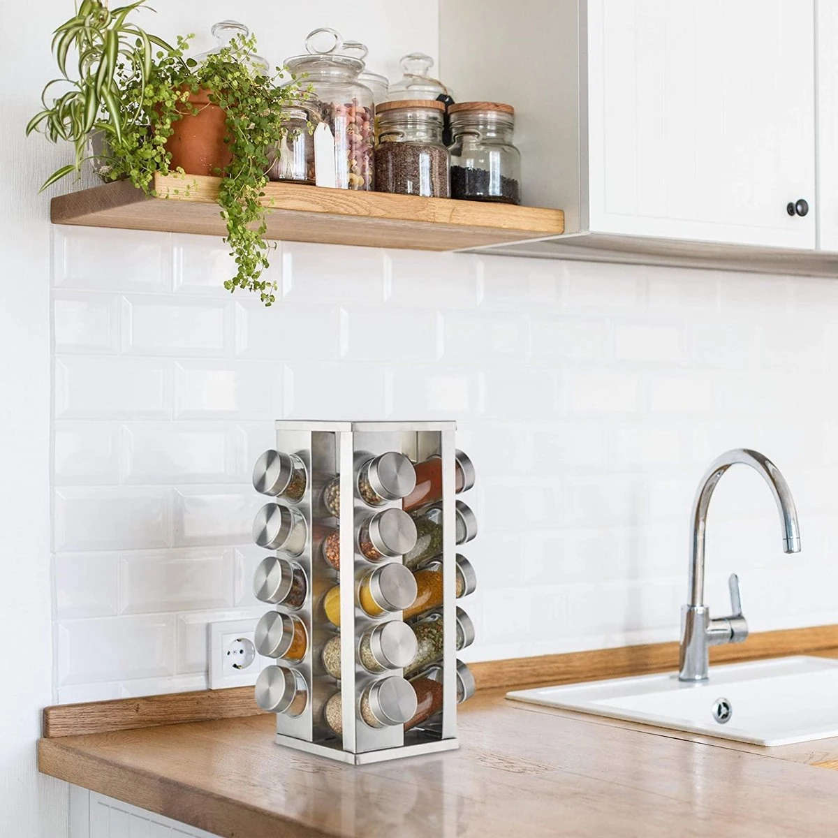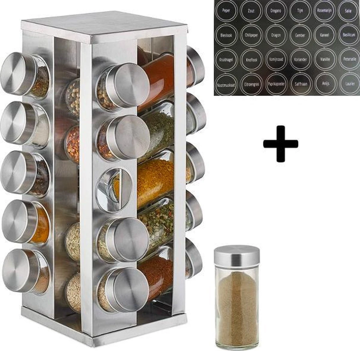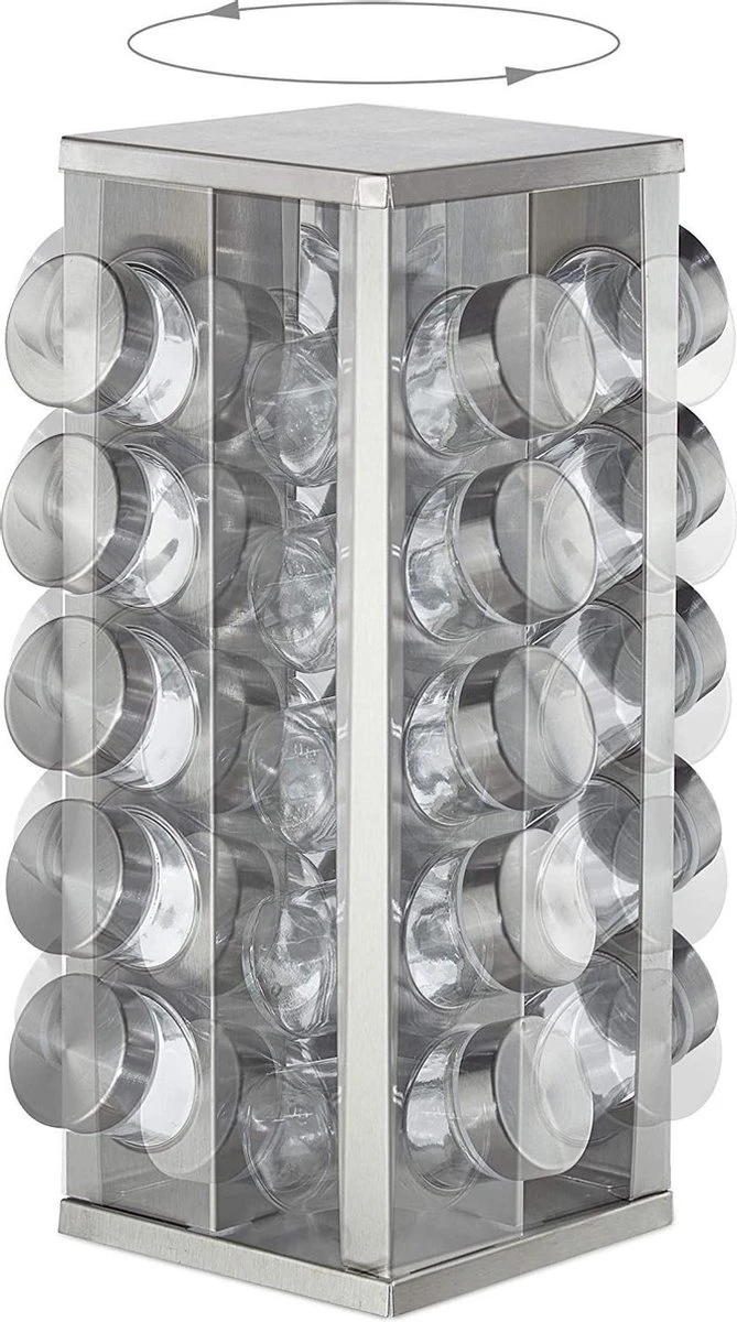 Draaibaar kruidenrek inclusief 20 potjes voor een scherpe prijs. Pleasantwork biedt een stevig kruidenrek aan met een strak design, gemaakt van RVS. Dit zorgt ervoor dat het product sterk en goed te onderhouden is. Op de tafel, in de keuken, overal kan het neergezet worden. Door het soepele draaien van het rek is het gemakkelijk om van elke kant een potje te pakken of terug te plaatsen. Naast het rek en de potjes is er een vel stickers toegevoegd met 24 verschillende kruidennamen die u op de deksel van het potje kunt plakken. Zo is het overzichtelijk welke kruiden waar in het rek staan.