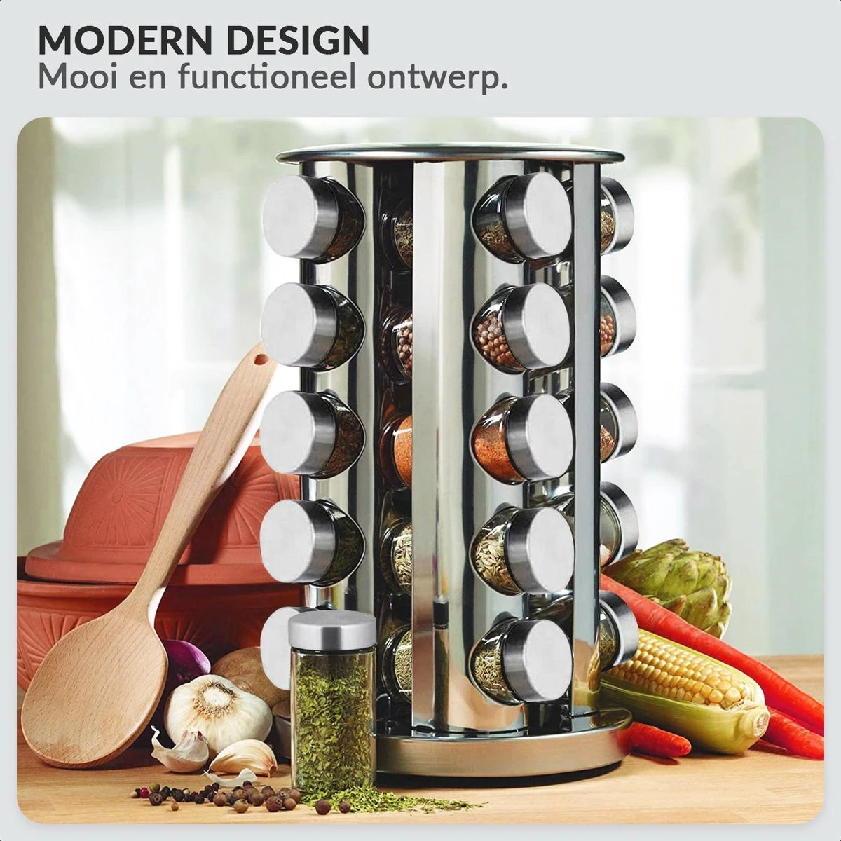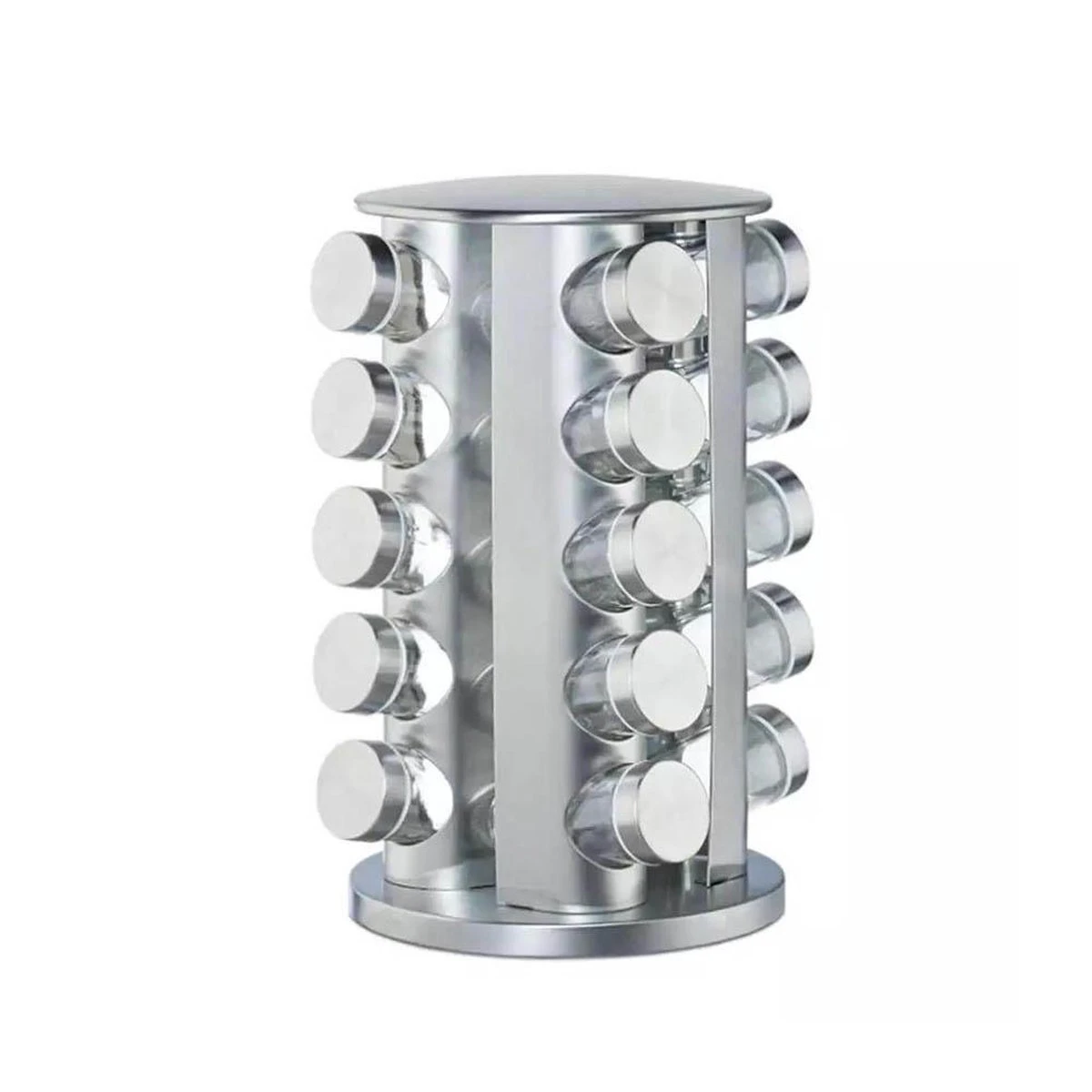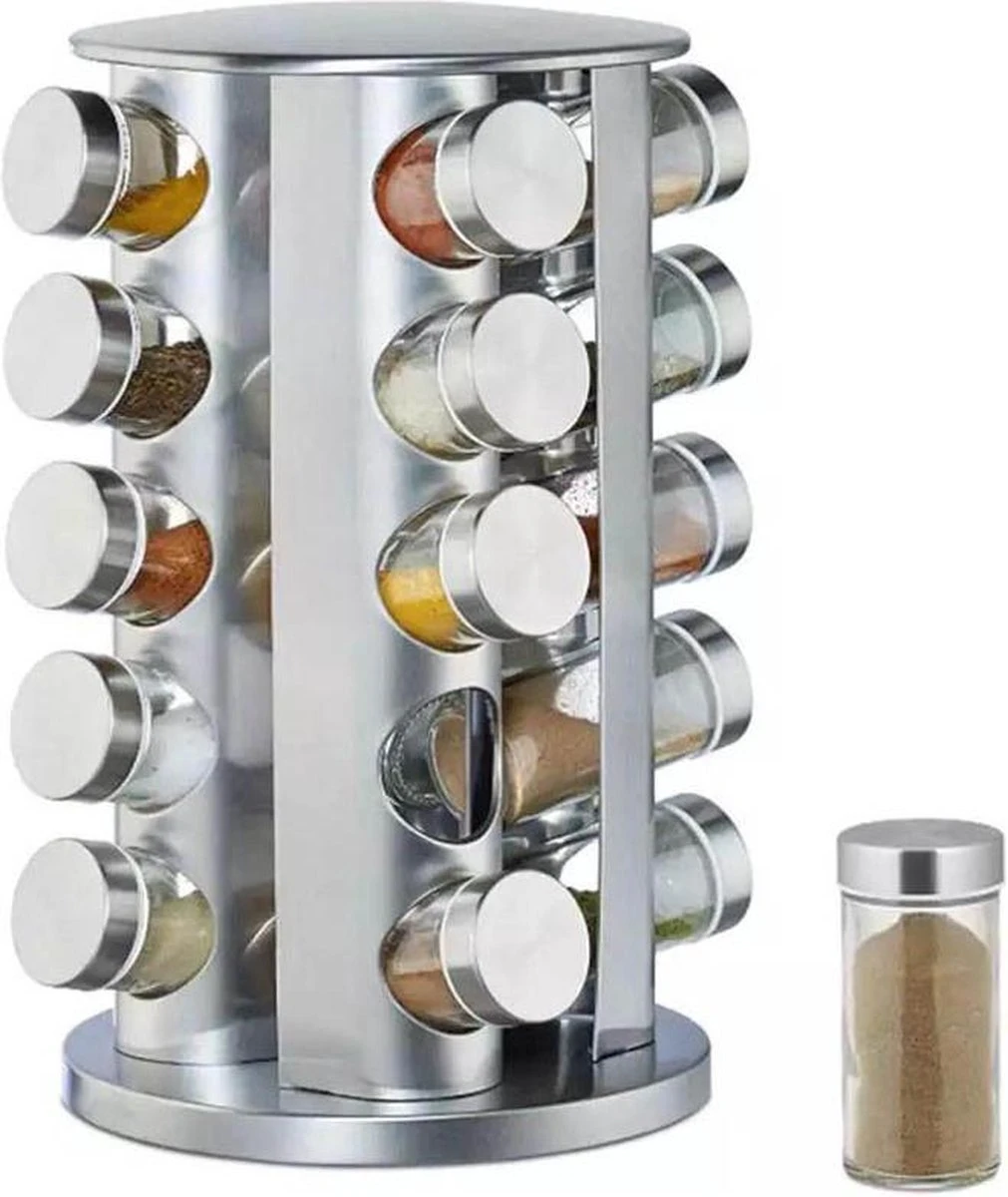 Het is afgelopen met de chaos in het keukenkastje. De moderne kruidencarrousel van roestvrij staal zorgt voor orde op het aanrecht. 20 glazen potjes voor het bewaren van al je kruiden zoals curry, paprikapoeder en zout. Onder het kruidenrekje is een kunststof schijf gemonteerd die het mogelijk maakt het rek te draaien. Zo kom je heel makkelijk bij al je kruidenpotjes. De glazen potjes zijn verdeeld over 5 etages en kunnen dankzij de strooigaatjes direct als strooipotjes worden gebruikt.